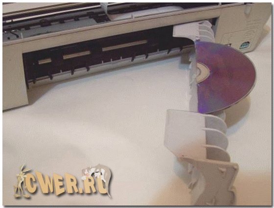 3. Через открытую крышку картриджей видно - как только начнется печать этикетки нажатием установленного выключателя останавливаем печать, через прорезь в задней крышке устанавливаем диск с покрытием для печати на струйном принтере, так чтобы край диска оказался под картриджами.