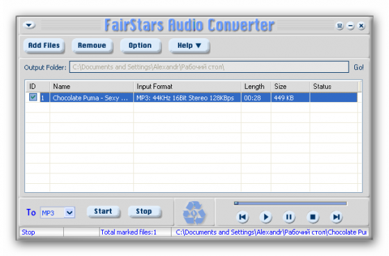 FairStars Audio Converter - является профессиональным инструментом для конвертации аудио файлов самых разнообразных форматов (WAV, APE, OGG, MP1, MP2, MP3, WMA, WMV, ASF в WMA, MP3, OGG, APE, WAV). Кроме конвертации утилита позволяет нормализовать композиции по звучанию, улучшить качество воспроизведения, имеет встроенный плеер и позволяет редактировать ID3 теги.