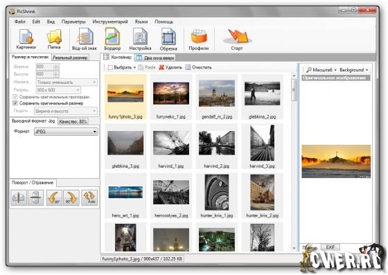 PicShrink – это полезная сервисная программа для цифровых изображений. Запросто сжимает множество форматов изображений (bmp, jpg, gif, png, wmf, emf), используя мощную систему сжатия, уменьшения больших размеров файла ваших изображений, оптимизирования картинок для быстрой загрузки из Web, отправляйте по электронной почте маленькие изображения быстро и не превышая ограничений по отправке вложений. Также к характеристикам относится пакетное преобразование файлов и сервисные программы по добавлению водяных знаков.