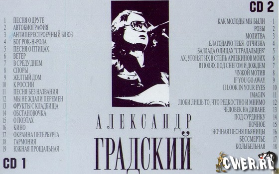 В 1976 году Градский сочиняет и записывает первую часть сюиты "Русские песни", а в 1978 г, -вторую часть. Начиная с этого времени, Градский 'выдает" одну студийную работу за другой: "Утопия АГ", "Сатиры", "Сама жизнь", "Звезда полей", "Ностальгия", "Флейта и Рояль" на стихи классиков, "Концерт-сюита", "Размышления шута" (сборник записей 1971 -74 годов, в котором А.Г. доказывает возможность пения на русском языке в разных рок-стилях), "Монте-Кристо", "Экспедиция" на свои стихи, опера "Стадион" (либретто А.Г. и Маргариты Пушкиной), балет "Человек" (либретто А.Г.).