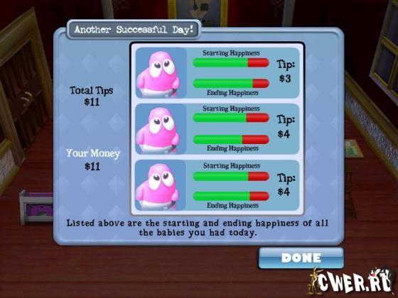 Эта веселая и увлекательная игра очень проста. Вы выступаете в роли няни в необычном городке монстриков. Ваша задача вовремя покормить, уложить спать, поухаживать и поиграть с малышами, за что вам и будут начислять деньги.