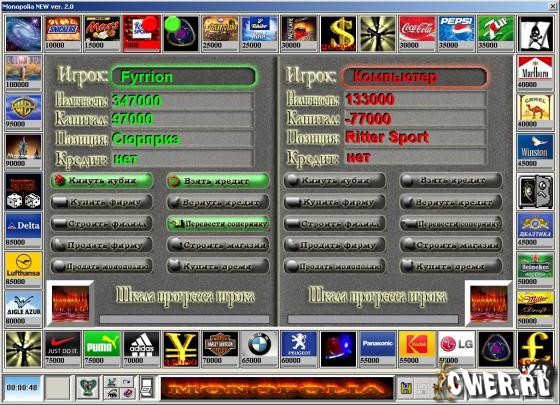 Игра предназначена для двоих человек, а также, в случае отсутствия соперника, можно посостязаться в игре с Компьютером. В начале каждой игры игроки уже имеют наличную сумму денег в размере 250 тысяч уе. Но не начальный капитал! Капитал Вы должны заколотить сами в течение всей игры. Учитывая, что подобного рода игры могут продолжаться до бесконечности, то процесс игры разделен на два этапа.