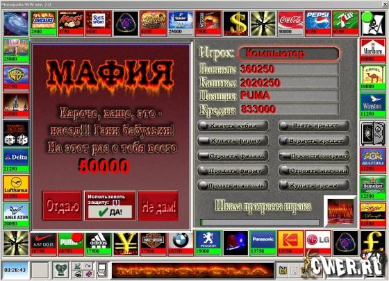 Игра предназначена для двоих человек, а также, в случае отсутствия соперника, можно посостязаться в игре с Компьютером. В начале каждой игры игроки уже имеют наличную сумму денег в размере 250 тысяч уе. Но не начальный капитал! Капитал Вы должны заколотить сами в течение всей игры. Учитывая, что подобного рода игры могут продолжаться до бесконечности, то процесс игры разделен на два этапа.