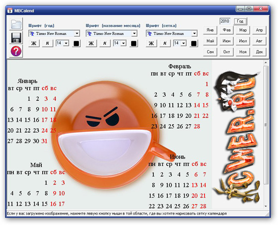 MBCalend - программа для рисования календарей на обоях, а также любых других изображениях. Является своего рода «Paint-ом для календарей», очень проста в освоении и позволяет нарисовать полноценный календарь за небольшое количество кликов. Теперь для создания календаря вам не нужно будет пользоваться такими программами, как Adobe Photoshop или Corel Draw, по причине их громоздкости.