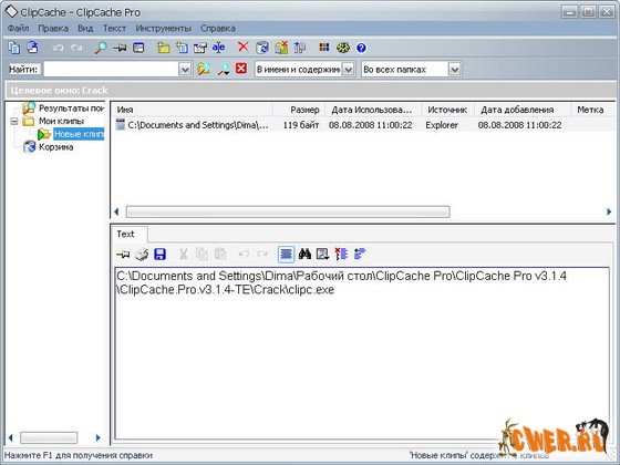 ClipCache Pro - менеджер буфера обмена (МБО). Призвание всякого МБО - компенсировать недостаток “родного” виндусового клипборда. Недостаток был очевиден уже десять лет назад, однако “Микрософт” из благородных побуждений (не лишать же хлеба чужих программистов?) его игнорирует. Смысл проблемы в том, что каждый скопированный в буфер объект (текст, изображение и т. п.) выталкивает из буфера предыдущий. Поэтому без МБО вы не сможете поместить в буфер десяток разных объектов, а затем вставить их в других местах: придется метаться туда-сюда из одного приложения в другое все десять раз. В ClipCache Pro есть полный набор навороченного МБО.