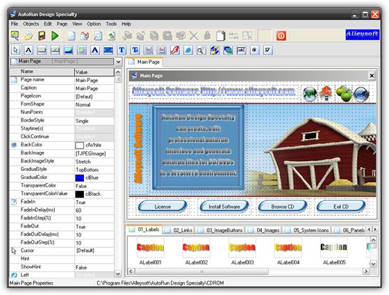 AutoRun Design Specialty - программа, являющаяся мощным инструментом визуализации для быстрого создания профессиональных интерфейсов авто запуска и презентаций для ваших дисков. Программа предоставляет легкий способ для создания, редактирования профессиональных интерфейсов авто запуска и генерации файлов авто запуска для дисков в CD и DVD форматах с помощью простого в использовании WYSIWYG интерфейса, через который вы с легкостью сможете управлять, редактировать, добавлять и удалять объекты при помощи простых перетаскиваний элементов, кликов мыши и функцией мгновенного пред просмотра готового интерфейса в действии (со всеми звуковыми и анимационными эффектами).