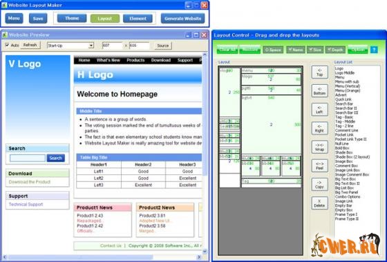 Website Layout Maker - это еще один инструмент для пробы своих сил в сайтопостроении. Не только простота и принципиально новая парадигма построения отличают эту программу от себе подобных - сборка-перемещение элементов страниц методом обычного вбрасывания, легкого манипулирования и позицирования - но и то, что шаг за шагом пользователь постепенно погружается в само понятие HTML, изучает, осваивает, запоминает значение тегов и занимается ручной правкой своего проекта. Имеется множество наборов элементов и шаблонов. Результы работы программы проверены на правильное отображение в браузерах: IE6, IE7, Firefox 2, Firefox 3, Opera 9.x, Safari 3.x.