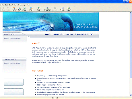 WYSIWYG Web Builder - программа для создания веб-страниц, которая автоматически создает HTML-код, в то время, как вы просто размещаете объекты, т.е. знание HTML от вас совершенно не требуется. Просто перетащите необходимые объекты в любое место страницы. После этого останется только закачать получившиеся файлы на сервер, с помощью встроенного инструмента "Публикация".