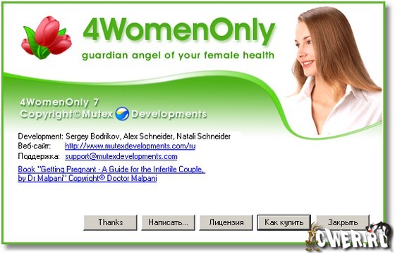 4WomenOnly - очень удобный и простой в использовании ежемесячный индивидуальный календарь менструальных циклов для женщин. Это одна из самых мощных систем для заботы о здоровье женщин. С помощью программы Вы сможете определить дни менструальных циклов, овуляций и дней, безопасных для занятий любовью, дабы избежать нежелательной беременности. Календарь поможет Вам использовать естественный метод контрацепции. Он обозначит дни с большей вероятностью беременности, а также поможет попытаться предсказать пол и дату рождения Вашего будущего ребенка. В календаре есть система напоминаний и ежедневного сбора информации о Вашем состоянии, календарь, статистика, возможность экспорта результатов и вывода их на печать, защита паролем и много других полезных функций.