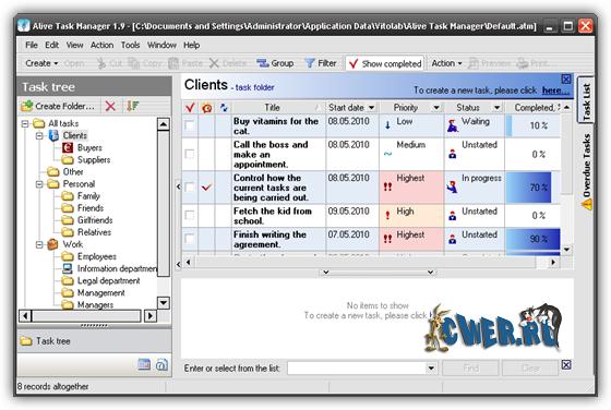 Alive Task Manager – это простая и эффективная сервисная программа для планирования различных заданий. Данная программа может быть использована для генерирования и просмотра персональной временной таблицы, напоминания об определенных событиях, создания повторяющихся заданий, установке правил для отложенных заданий и т.д. Поддержка структуры заданий свободного типа упрощает размещение заданий с атрибутами корреспонденции. Различные папки (например, бизнес, персональные, сотрудники и т.д.) могут быть созданы для размещения релевантных заданий. Специальная папка «Все задания» отображает все задачи созданные в Alive Task Manager. Данная функция очень удобна для поиска и просмотра.