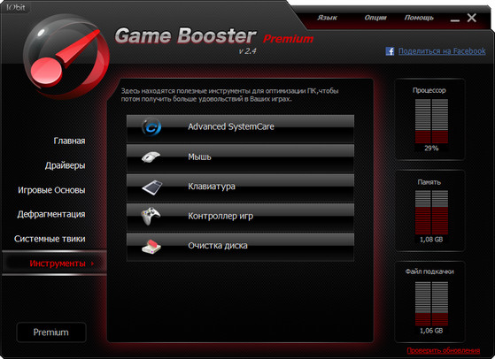 Game Booster предназначена для подготовки операционной системы к оптимальной производительности перед запуском игровых приложений. Game Booster будет полезна «новичкам» и поможет выгрузить нужные приложения и подготовить систему к нормальной работоспособности запускаемой игры. Производители подчеркивают, что Game Booster не является инструментом для «оверклокинга», она не вносит никаких модификаций в реестр Windows, а также не берет на себя ответственность за изменение настроек системы. Сразу после активации приложение отключает ряд ненужных системных служб Windows, осуществляет быструю очистку оперативной памяти RAM, а также предлагает завершить работу программ, запущенных в фоновом режиме.